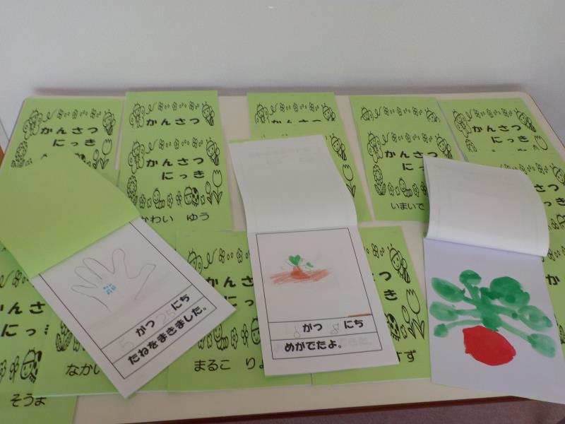 赤カブを収穫、もみじ組は観察日記を作りました。もみじ組前に展示中です。