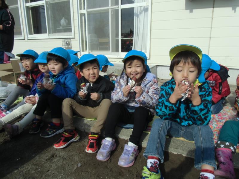 アツアツの焼いも、おいしいね! 葉っぱとお芋の焼けるにおい、煙がもくもく。出来上がったお芋は甘くておいしくて、みんないいお顔になりました。 2017/11/02 焼いもをしました 園庭の落ち葉を集めて焼いもをしました。 2017/11/02